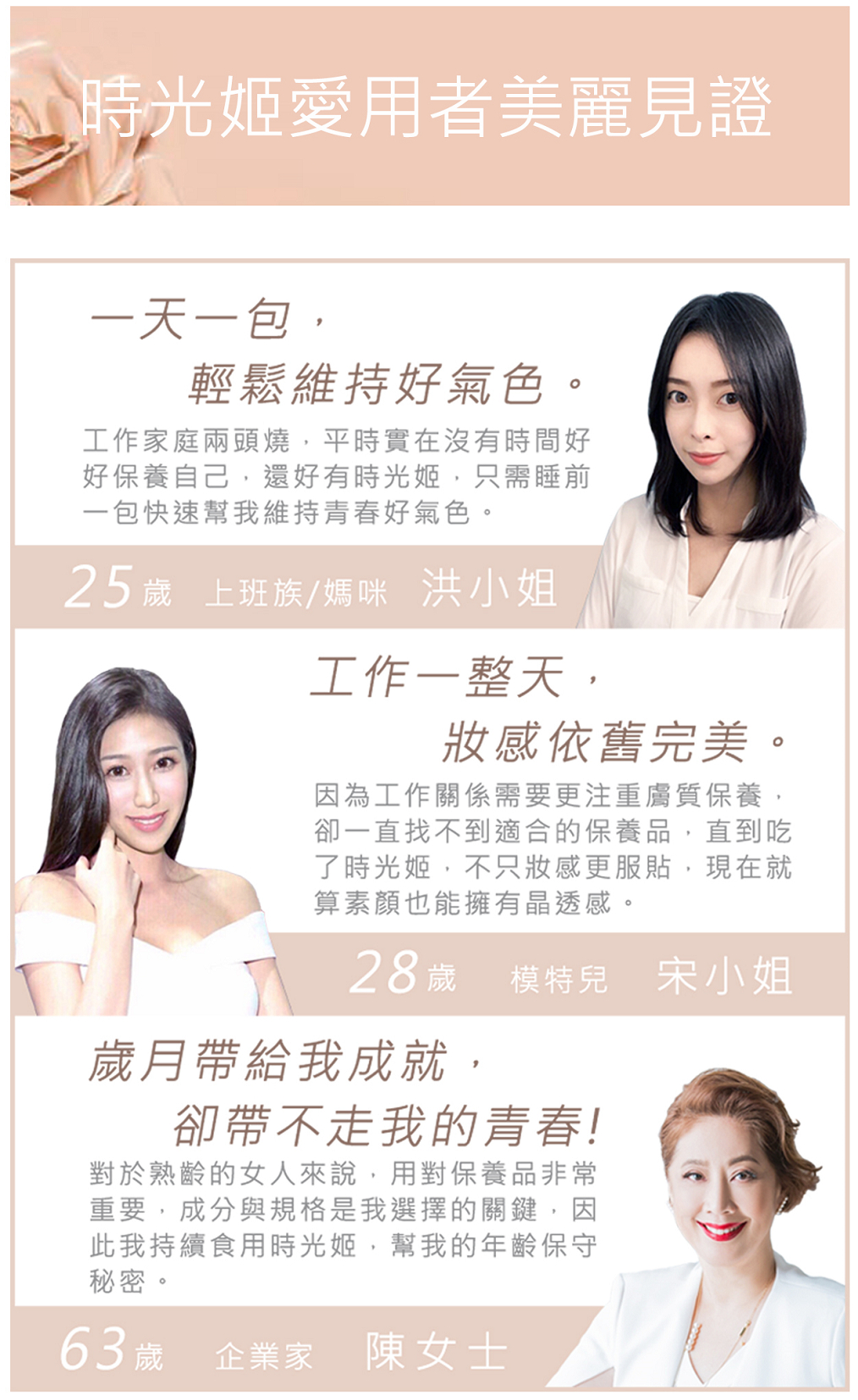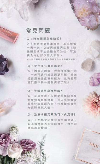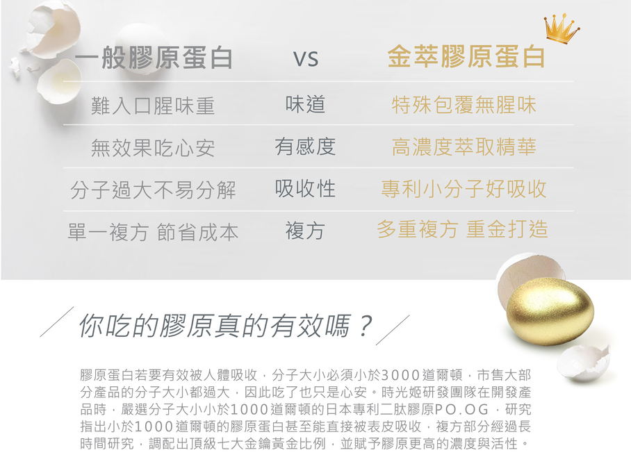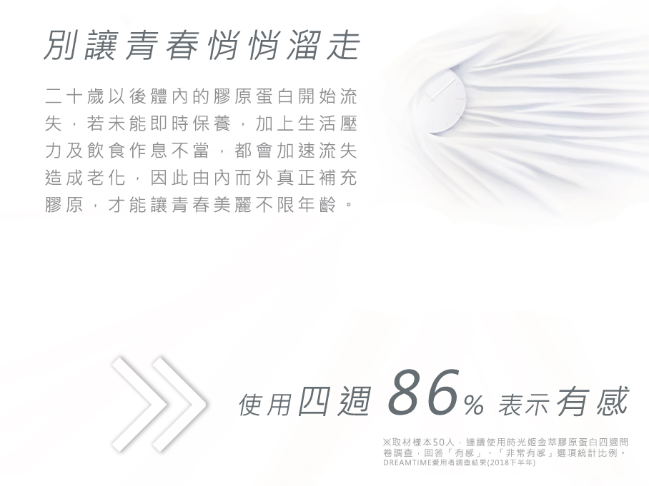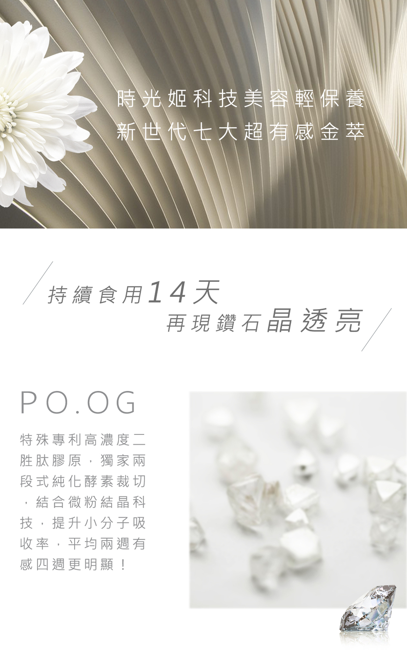 時光姬金萃膠原蛋白希望幫助愛美的你鎖住青春美麗的時光!經研究發現外在 的保養品吸收效果有限,口服劑型才能真正由內而外完整補充,快速達到保養 功效。時光姬採用獨家萃煉奢華美容配方,打造創造新世代保養科技,裡外兼 具極致滲透,呈現天生美。