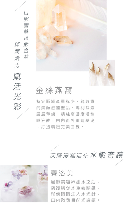 保養專家表示,現代女性普遍因為生活壓力過大、飲食作息不正常,導致膚質嚴重失衡。因此光是依靠外在保養品,很難有效改變現有膚況,若想擁有人人羨慕的逆齡光澤,除了使用外在保養的輔助,從內部的補充美顏成分打好基礎,才能真正由內而外改善膚質,創造完美素顏肌。